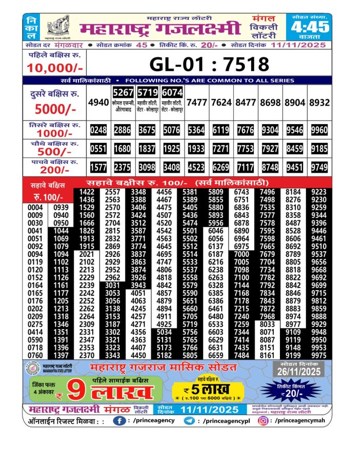 Maharashtra Gaj Laxmi Lottery Result 11.11.2025