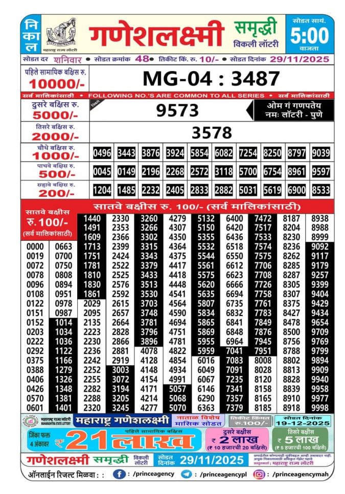 Maharashtra Ganeshlaxmi Weekly Lottery  Result 29.11.2025