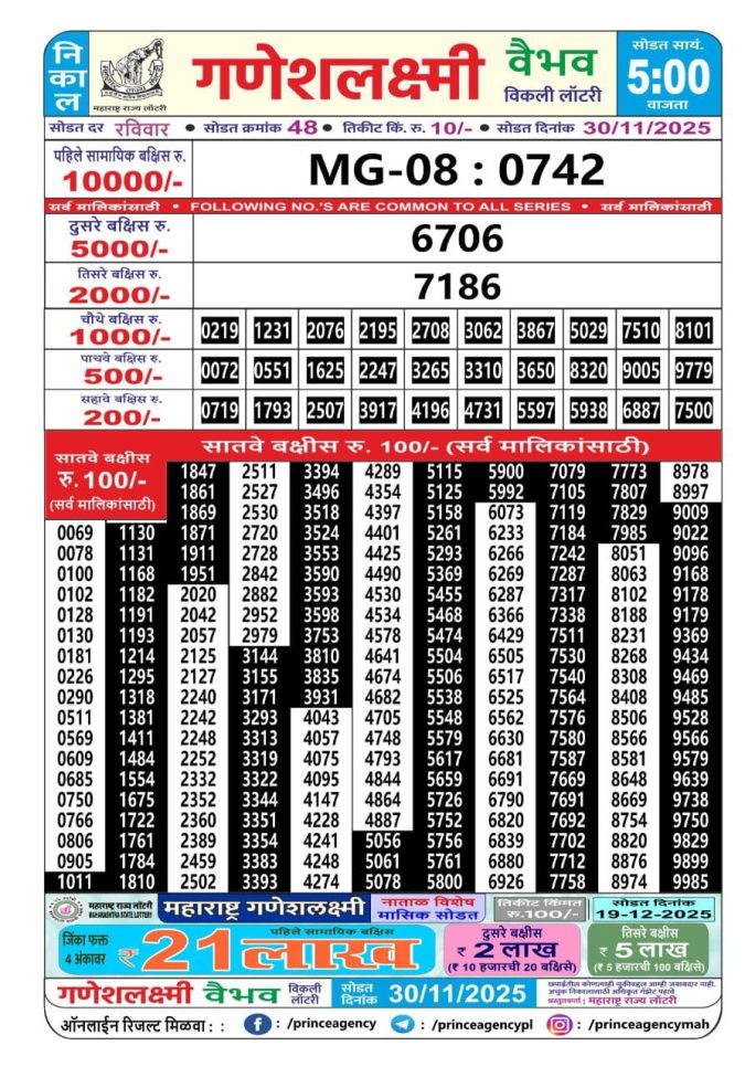 Maharashtra Ganeshlaxmi Weekly Lottery  Result 30.11.2025