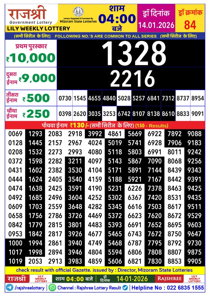 Rajshree Lily Weekly Lottery 4 PM Result 14.01.2026