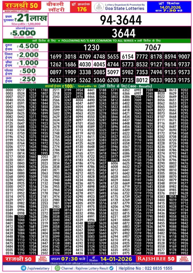 Rajshree Budh Weekly Lottery 1 PM Result 14.01.2026