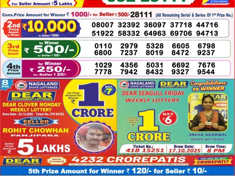 Dear 10 Orange Wednesday Weekly Lottery 1:30 PM Result 23.07.2025 July 23, 2025 Leave a Comment on Dear 10 Orange Wednesday Weekly Lottery 1:30 PM Result 23.07.2025 Share: XFacebookPinterestRedditVKDiggLinkedinMix Related Articles 0 93 Maharashtra Sagar Laxmi Weekly Lottery 4.15 PM Result 04.08.2025 0 111 Rajshree Sunflower Weekly Lottery 4 PM Result 12.05.2025 0 17 Dear Density Tuesday Weekly Lottery 8 PM Result 23.12.2025 0 99 Rajshree 10 Evening Weekly Lottery 5:40 Pm Result 16.06.2025