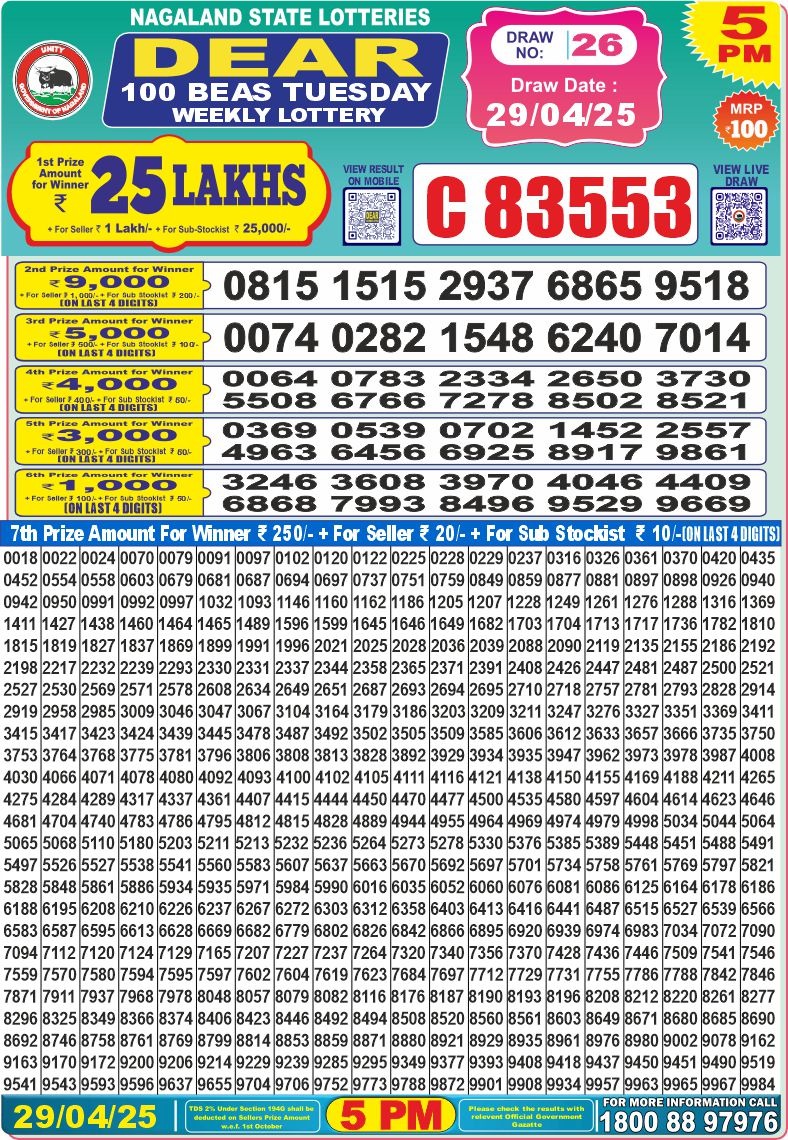 Dear 100 Beas Tuesday day Weekly Lottery 5 PM Result 29.04.25 April 29, 2025 Leave a Comment on Dear 100 Beas Tuesday day Weekly Lottery 5 PM Result 29.04.25 Share: XFacebookPinterestRedditVKDiggLinkedinMix Related Articles 0 120 Rajshree 50 Budh Weekly Lottery 7:30 Pm Result 04.06.2025 0 71 Rajshree 50 Shukra Weekly Lottery 7:30 PM Result 18.07.2025 0 103 Golden Star Shukra Weekly Lottery 9 Pm Result 10 May 2025 0 129 Rajshree Tuesday Weekly Lottery 8 Pm Result 13.05.2025