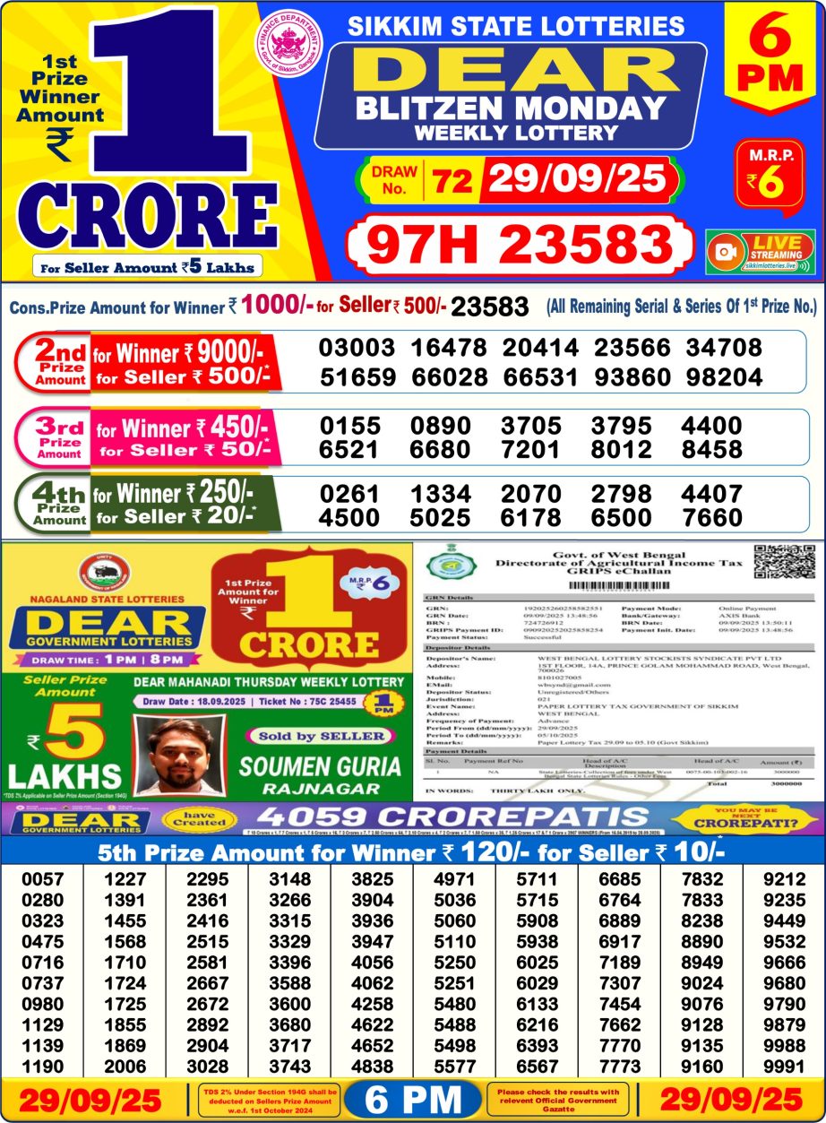 Dear Blitzen Monday Weekly Lottery 6 PM Result 29.09.2025