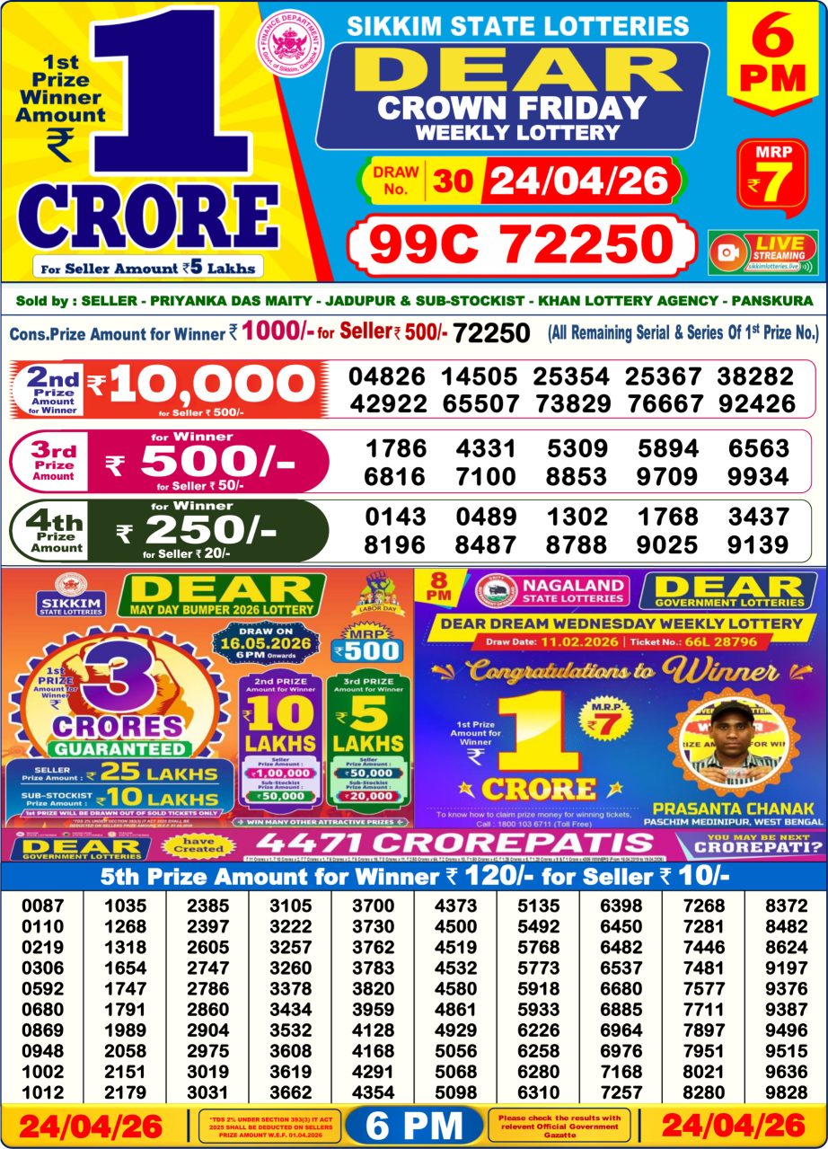 Dear Crown Friday Weekly Lottery 6 PM Result 24.04.2026 24 04 2026 Leave a Comment on Dear Crown Friday Weekly Lottery 6 PM Result 24.04.2026 Share: XFacebookPinterestRedditVKDiggLinkedinMix Related Articles 0 42 Rajshree 10 Evening Weekly Lottery 5:40 PM Result 30.03.2026 0 125 Rajshree Night 9pm Lottery Result 29.11.2025 0 22 Labh Laxmi Bliss Monday Weekly Lottery 4 PM Result 13.04.2026 0 62 Rajshree Ravi Weekly Lottery 2.25PM Result 08.03.2026