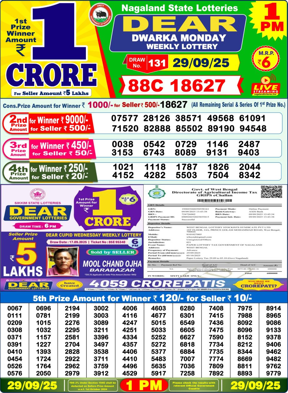 Dear Dwarka Monday Weekly Lottery 1 PM Result 29.09.2025 September 29, 2025 Leave a Comment on Dear Dwarka Monday Weekly Lottery 1 PM Result 29.09.2025 Share: XFacebookPinterestRedditVKDiggLinkedinMix Related Articles 0 26 Golden Star Shani Weekly Lottery 9 PM Result 11.10.2025 0 95 Maharashtra Gajlaxmi Weekly Lottery 4:45 PM Result 24.06.2025 0 94 Maharashtra Laxmi Weekly Lottery 4:15 PM Result 28.06.2025 0 84 Rajshree Som Weekly Lottery 1:00 PM Result 19.05.2025