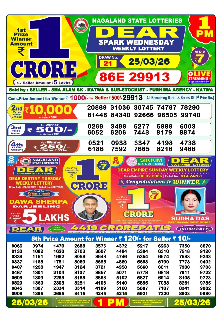 Dear Spark Wednessday Weekly Lottery 1 PM Result 25.03.2026 25 03 2026 Leave a Comment on Dear Spark Wednessday Weekly Lottery 1 PM Result 25.03.2026 Share: XFacebookPinterestRedditVKDiggLinkedinMix Related Articles 0 63 Rajshree Friday Weekly Lottery 8 PM Result 23.01.2026 0 50 Maharashtra Gajlaxmi Weekly Lottery Result 31.01.2026 0 64 Dear Star Thursday Weekly Lottery 1 PM Result 08.01.2026 0 67 Rajshree 50 Ravi Weekly Lottery 7:30 PM Result 21.12.2025
