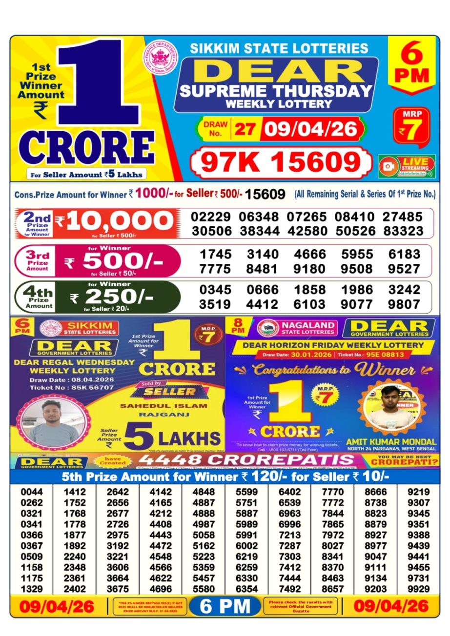 Dear Supreme Thursday Weekly Lottery 6 PM Result 09.04.2026 09 04 2026 Leave a Comment on Dear Supreme Thursday Weekly Lottery 6 PM Result 09.04.2026 Share: XFacebookPinterestRedditVKDiggLinkedinMix Related Articles 0 48 Maharashtra Vaibhav Laxmi Weekly Lottery Draw Result 13.03.2026 0 91 Golden Star Guru Weekly Lottery 9 PM Result 25.12.2025 0 76 Maharashtra Ganeshlaxmi Weekly Lottery Result 26.12.2025 0 84 Rajshree Mangal Weekly Lottery 1 PM Result 09.12.2025