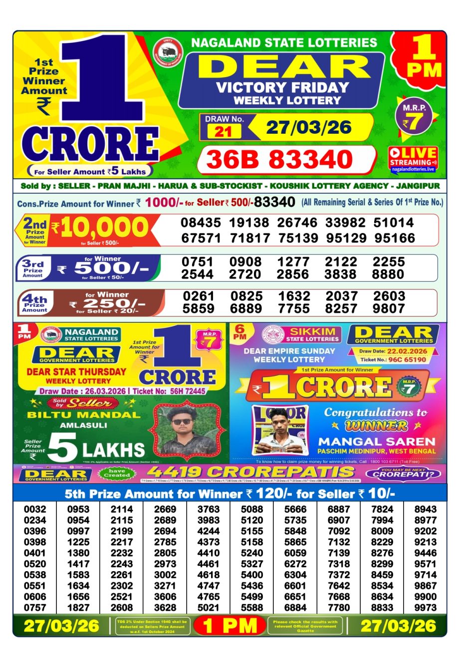 Dear Victory Friday Weekly Lottery 1 PM Result 27.03.2026 27 03 2026 Leave a Comment on Dear Victory Friday Weekly Lottery 1 PM Result 27.03.2026 Share: XFacebookPinterestRedditVKDiggLinkedinMix Related Articles 0 110 Rajshree jasmine Weekly Lottery 4 PM Result 28.11.2025 0 45 Dear Lucky Saturday Weekly Lottery 8 PM Result 07.03.2026 0 82 Dear Dream Wednesday Weekly Lottery 8 PM Result 10.12.2025 0 76 Dear Prestige Tuesday Weekly Lottery 6 PM Result 09.12.2025