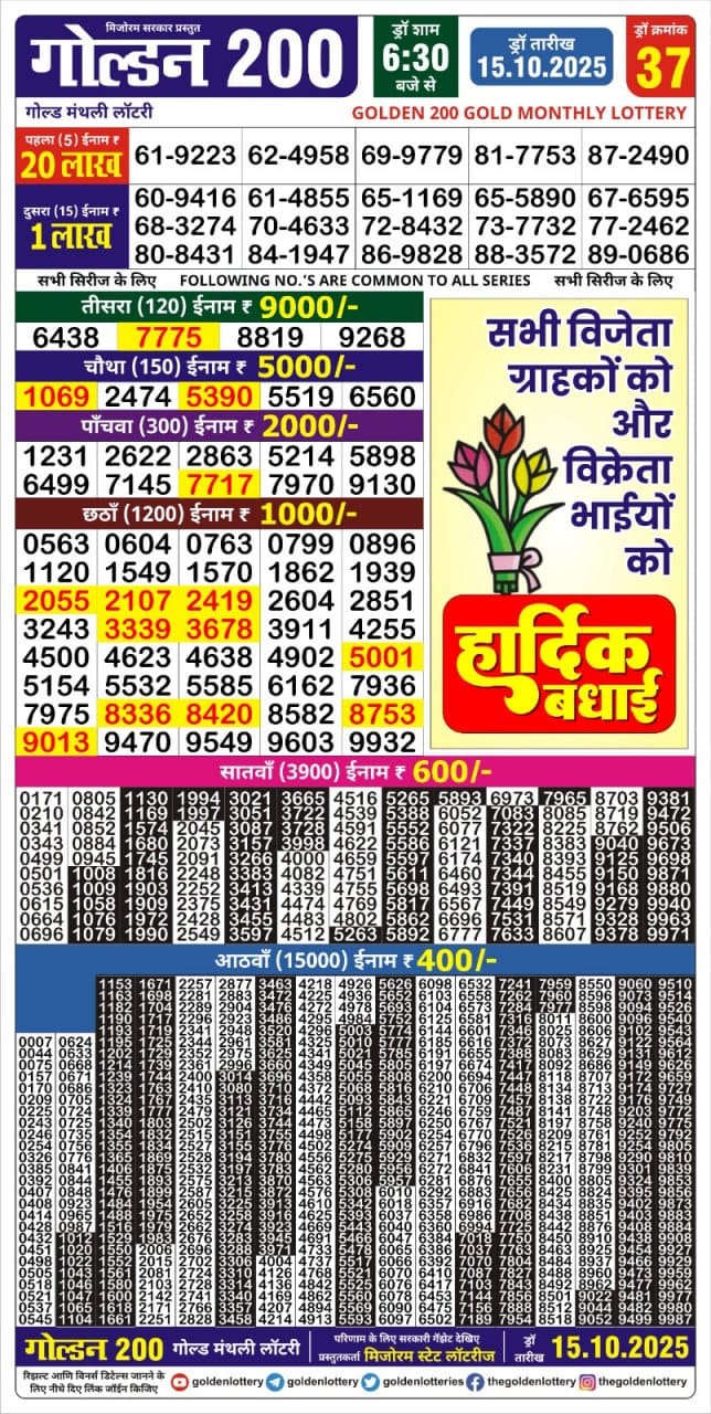 Golden 200 Monthly lottery Result 15.10.2025 October 15, 2025 Leave a Comment on Golden 200 Monthly lottery Result 15.10.2025 Share: XFacebookPinterestRedditVKDiggLinkedinMix Related Articles 0 55 Rajshree Ravi Weekly Lottery 1 PM Result 03.08.2025 0 37 Dear Meghna Friday Weekly Lottery 1 PM Result 26.09.2025 0 68 Rajshree 30 Guru Weekly Lottery 8:30 PM Result 03.07.2025 0 52 Dear Pelican Wednesday Weekly Lottery 8 PM Result 06.08.2025