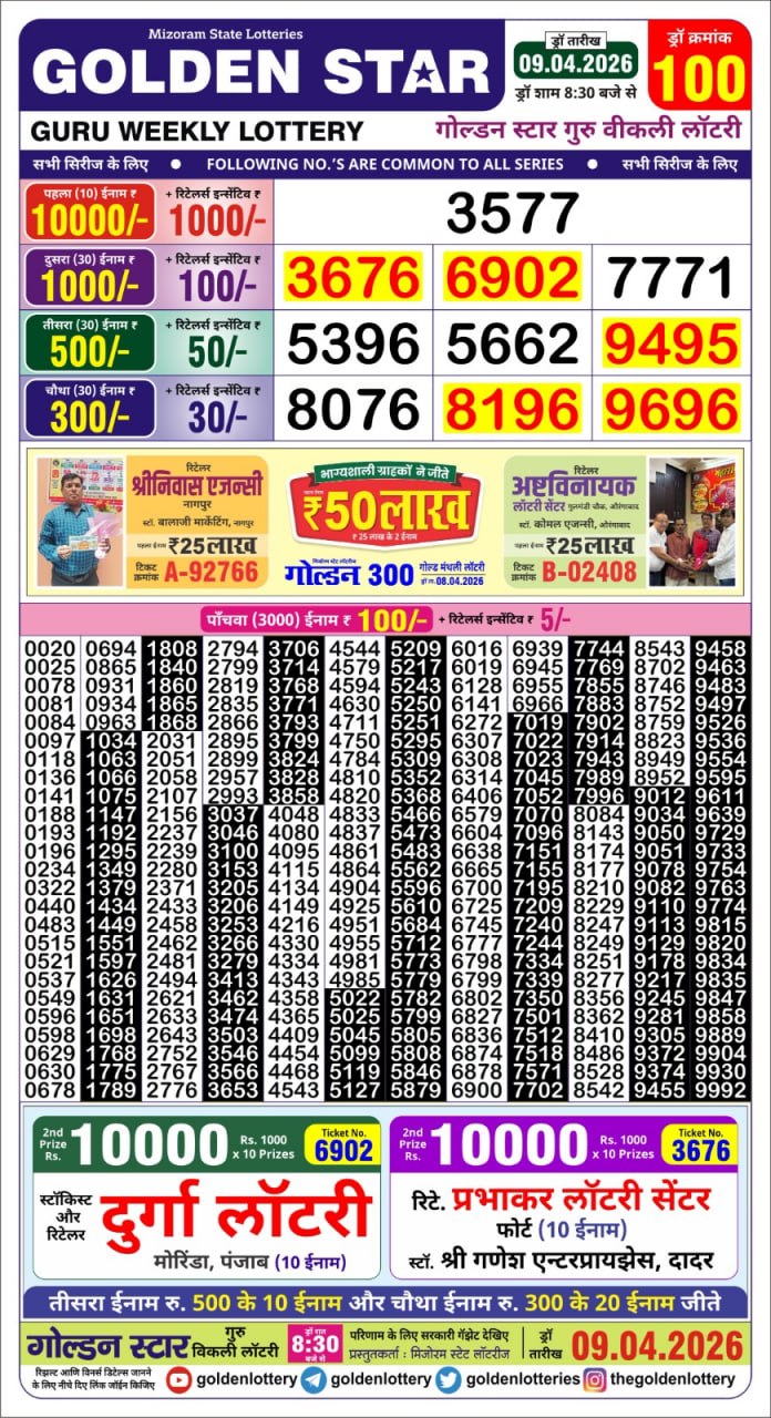 Golden Star Guru weekly lottery 8:30PM Result 09.04.2026 09 04 2026 Leave a Comment on Golden Star Guru weekly lottery 8:30PM Result 09.04.2026 Share: XFacebookPinterestRedditVKDiggLinkedinMix Related Articles 0 31 Rajshree 50 Budh Weekly Lottery 7:30 PM Result 01.04.2026 0 38 Punjab State Dear 50 Chief Thursday Weekly Lottery 5 PM Result 19.03.2026 0 90 Dear Supreme Thursday Weekly Lottery 6 PM Result 29.01.2026 0 26 Dear Horizon Friday Weekly Lottery 8 PM Result 03.04.2026