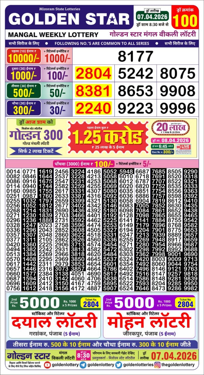 Golden Star Mangal weekly lottery 8:30PM Result 07.04.2026 07 04 2026 Leave a Comment on Golden Star Mangal weekly lottery 8:30PM Result 07.04.2026 Share: XFacebookPinterestRedditVKDiggLinkedinMix Related Articles 0 67 Golden 100 Monthly lottery Result 04.02.2026 0 56 Rajshree 10 Evening Weekly Lottery 5:40 PM Result 07.02.2026 0 25 Dear Supreme Thursday Weekly Lottery 6 PM Result 02.04.2026 0 11 Rajshree Night 9pm Lottery Result 16.04.2026