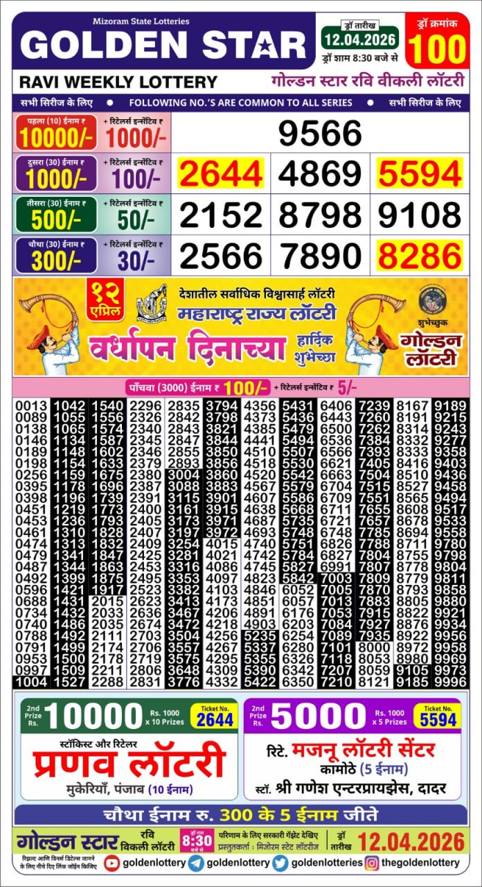 Golden Star Ravi Weekly Lottery 8:30PM Result 12.04.2026 12 04 2026 Leave a Comment on Golden Star Ravi Weekly Lottery 8:30PM Result 12.04.2026 Share: XFacebookPinterestRedditVKDiggLinkedinMix Related Articles 0 25 Rajshree Marigold Weekly Lottery 4 PM Result 06.04.2026 0 39 Golden Star Shukra weekly lottery 7 PM Result 27.03.2026 0 36 Dear Dream Wednessday Weekly Lottery 8 PM Result 18.03.2026 0 70 Golden Star Guru weekly lottery 7 PM Result 05.03.2026