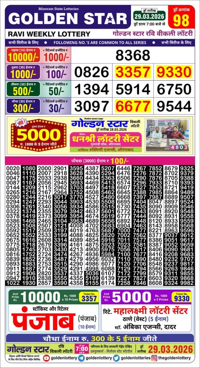 Golden Star Ravi Weekly Lottery 7 PM Result 29.03.2026 29 03 2026 Leave a Comment on Golden Star Ravi Weekly Lottery 7 PM Result 29.03.2026 Share: XFacebookPinterestRedditVKDiggLinkedinMix Related Articles 0 41 Golden Star Shukra weekly lottery 7 PM Result 06.03.2026 0 70 Golden Star Som Weekly Lottery 9 PM Result 29.12.2025 0 64 Rajshree orchid Weekly Lottery 4 PM Result 20.12.2025 0 63 Rajshree Guru Weekly Lottery 1 PM Result 01.01.2026