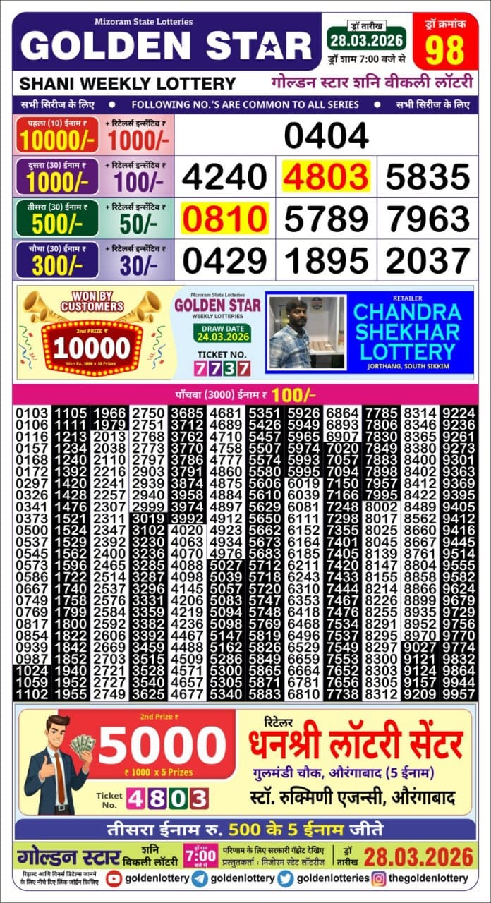 28 03 2026  Leave a Comment on Golden Star Shani weekly lottery 7 PM Result 28.03.2026