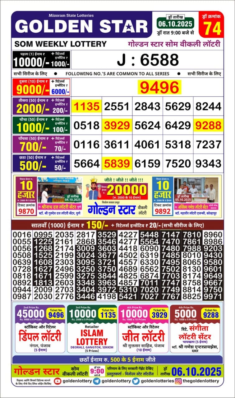 Golden Star Som Weekly Lottery 9 PM Result 06.10.2025 October 6, 2025 Leave a Comment on Golden Star Som Weekly Lottery 9 PM Result 06.10.2025 Share: XFacebookPinterestRedditVKDiggLinkedinMix Related Articles 0 33 Dear 10 Conifer Friday Weekly Lottery 7 PM Result 19.09.2025 0 12 Rajshree Som Weekly Lottery 1 PM Result 03.11.2025 0 33 Rajshree 10 Evening Weekly Lottery 5:40 PM Result 21.09.2025 0 113 Dear 10 Green Tuesday Weekly 1:30 Pm Result 27.05.2025
