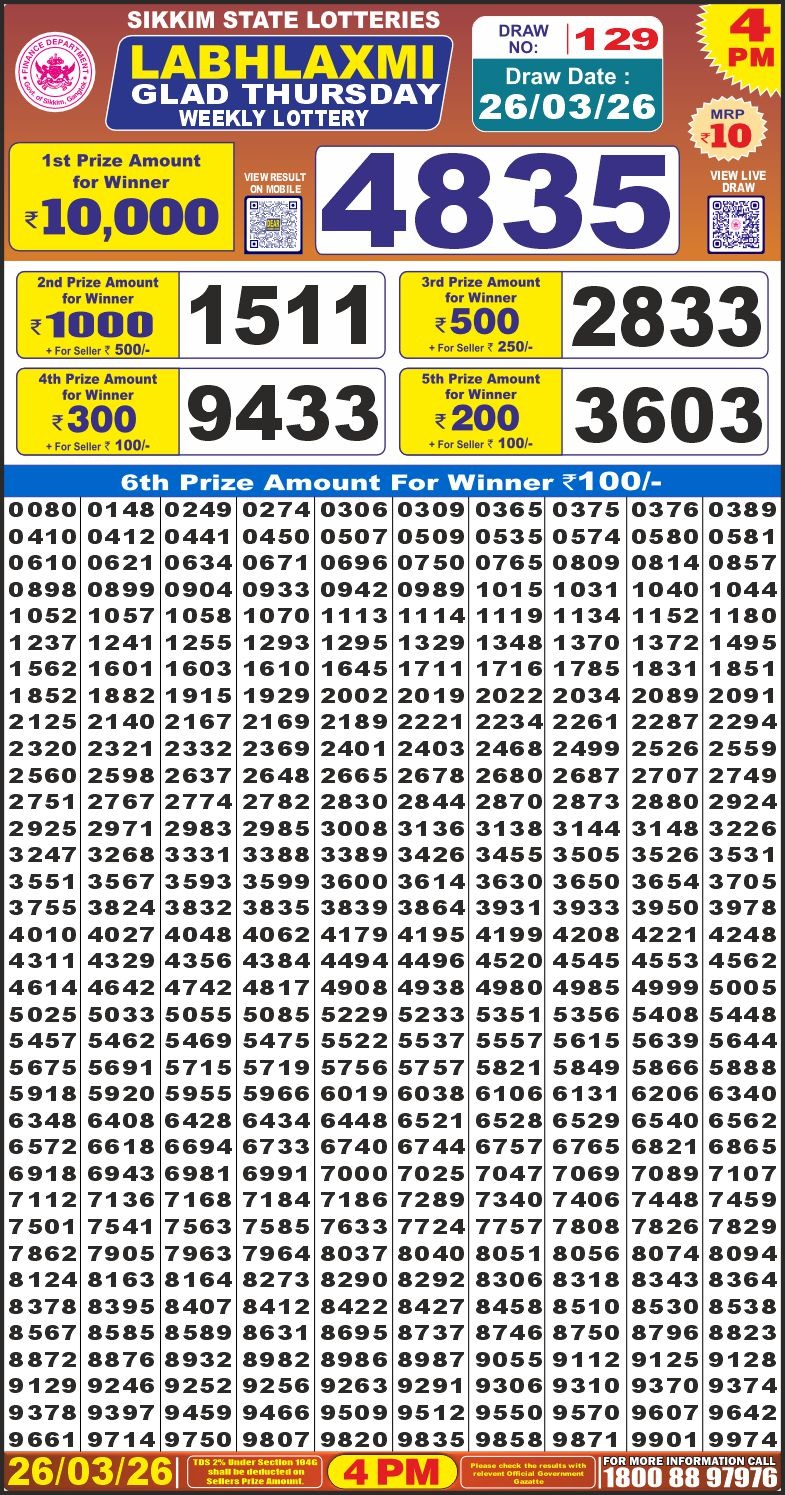 Labh Laxmi Glad Thursday Weekly Lottery 4 PM Result 26.03.2026 26 03 2026 Leave a Comment on Labh Laxmi Glad Thursday Weekly Lottery 4 PM Result 26.03.2026 Share: XFacebookPinterestRedditVKDiggLinkedinMix Related Articles 0 31 Rajshree Night 9pm Lottery Result 19.03.2026 0 60 Dear Rise Monday Weekly Lottery 1 PM Result 02.02.2026 0 58 Maharashtra Gajlaxmi Weekly Lottery Result 04.02.2026 0 71 Punjab State 1000 Quarterly Lottery Result 10.01.2026