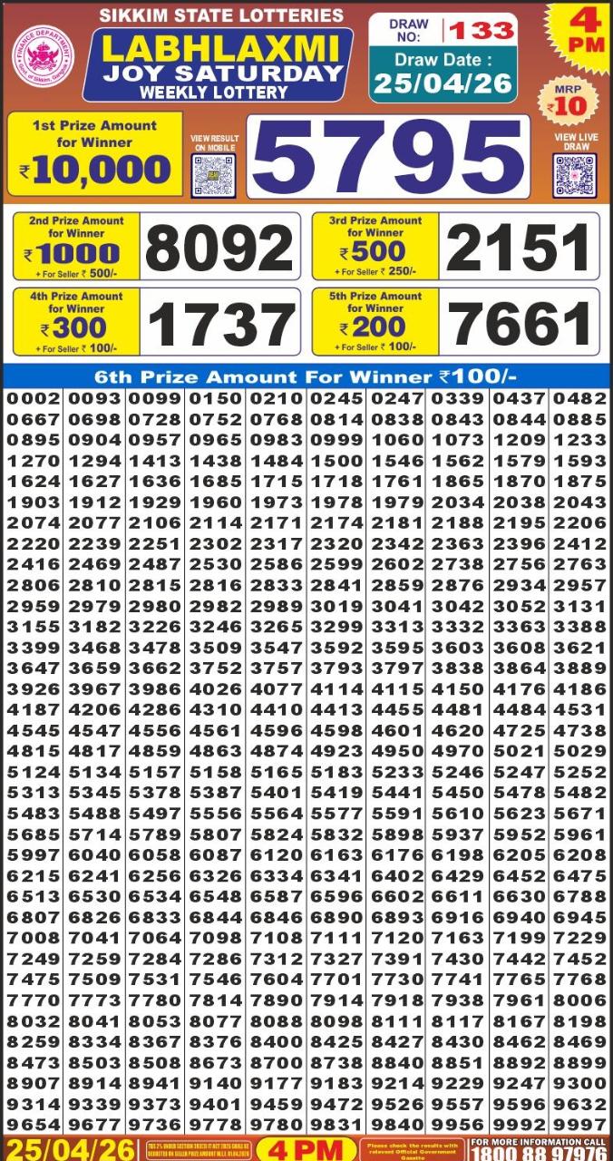 Labh Laxmi Joy Saturday Weekly Lottery 4 PM Result 25.04.2026 25 04 2026 Leave a Comment on Labh Laxmi Joy Saturday Weekly Lottery 4 PM Result 25.04.2026 Share: XFacebookPinterestRedditVKDiggLinkedinMix Related Articles 0 131 Maharashtra Gaj Laxmi Lottery Result 23.11.2025 0 91 Rajshree 50 Ravi Weekly Lottery 7:30 PM Result 08.02.2026 0 87 Rajshree 10 Evening Weekly Lottery 5:40 PM Result 16.12.2025 0 134 Maharashtra Gaj Laxmi Lottery Result 17.11.2025