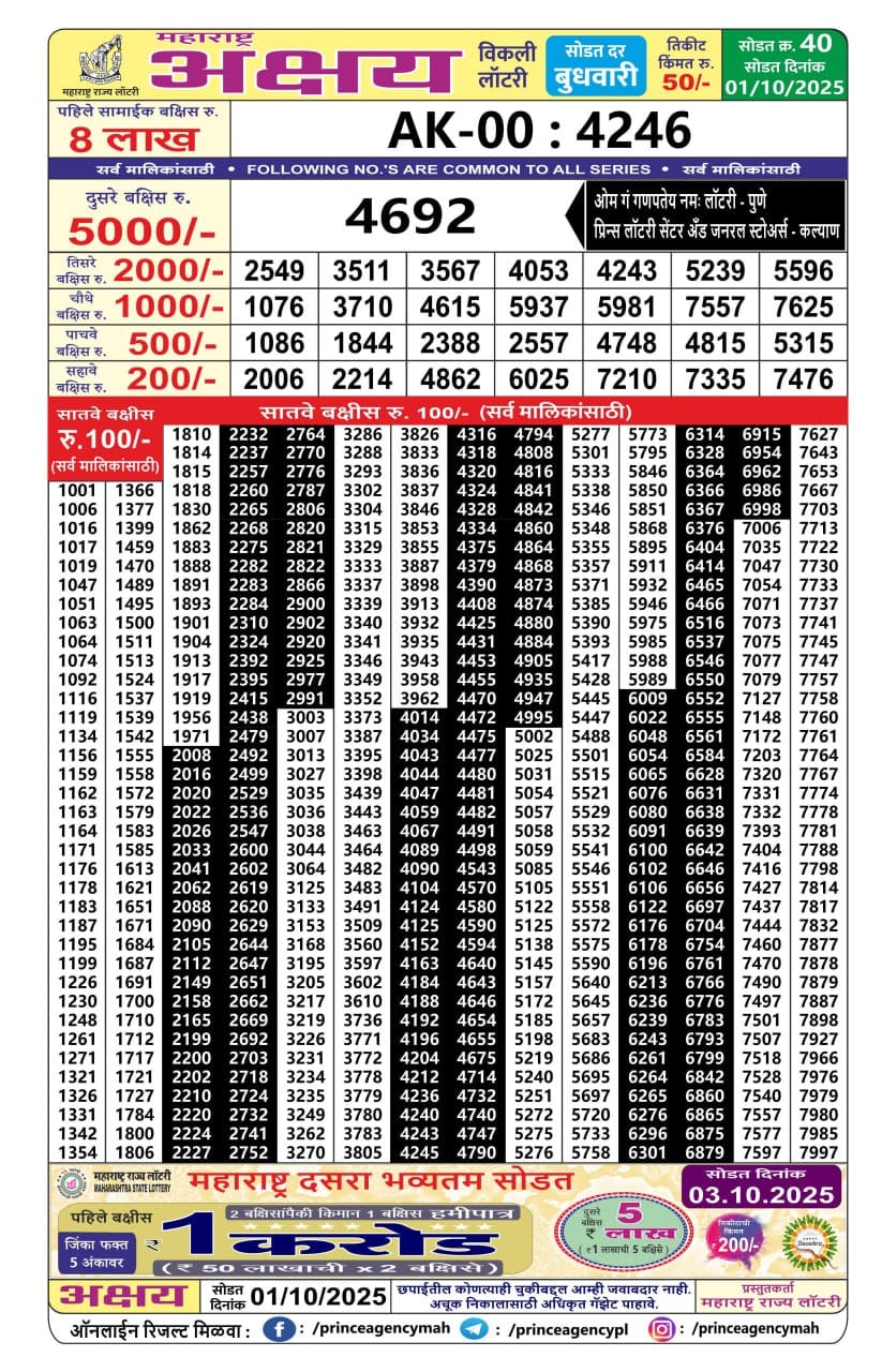 Maharashtra Akshay Weekly Lottery 4.15 PM Result 01.10.2025