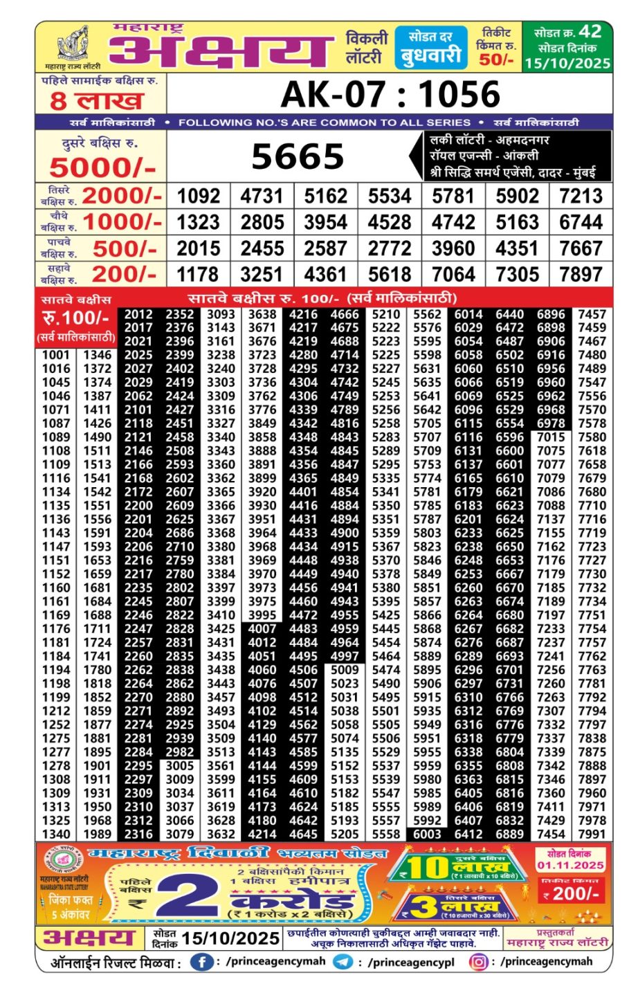 Maharashtra Akshay Weekly Lottery 4.15 PM Result 15.10.2025 October 15, 2025 Leave a Comment on Maharashtra Akshay Weekly Lottery 4.15 PM Result 15.10.2025 Share: XFacebookPinterestRedditVKDiggLinkedinMix Related Articles 0 105 Punjab State Dear 50 Bronco Tuesday Weekly Lottery 6 pm Result 09.09.2025 0 57 Rajshree Mangal Weekly Lottery 1 PM Result 29.07.2025 0 77 Dear 10 Orange Wednesday Weekly 1:30 PM Result 18.06.2025 0 76 Punjab State Dear 50 Monthly Lottery Result 17.06.2025