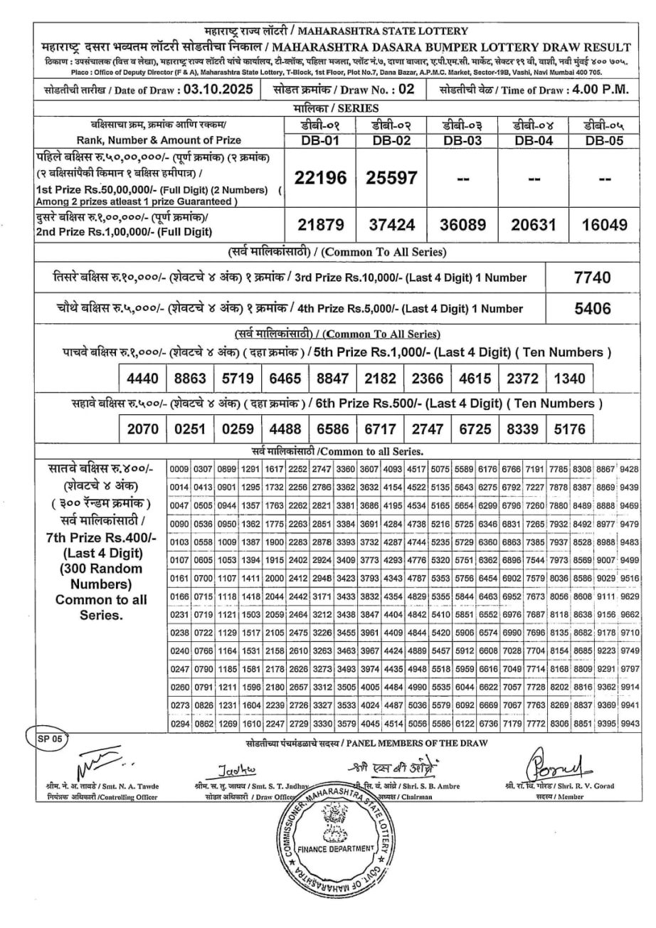Maharashtra Dasara Bumper Lottery result 03.10.2025 October 3, 2025 Leave a Comment on Maharashtra Dasara Bumper Lottery result 03.10.2025 Share: XFacebookPinterestRedditVKDiggLinkedinMix Related Articles 0 101 Golden 1000 Monthly Lottery Result 30 April 2025 0 61 Dear 50 Jhelum Monday Weekly Lottery 5 Pm Result 23.06.2025 0 70 Rajshree Som Weekly Lottery 1:00 Pm Result 30.06.2025 0 83 Dear Blitzen Monday Weekly Lottery 6 Pm Result 30.06.2025