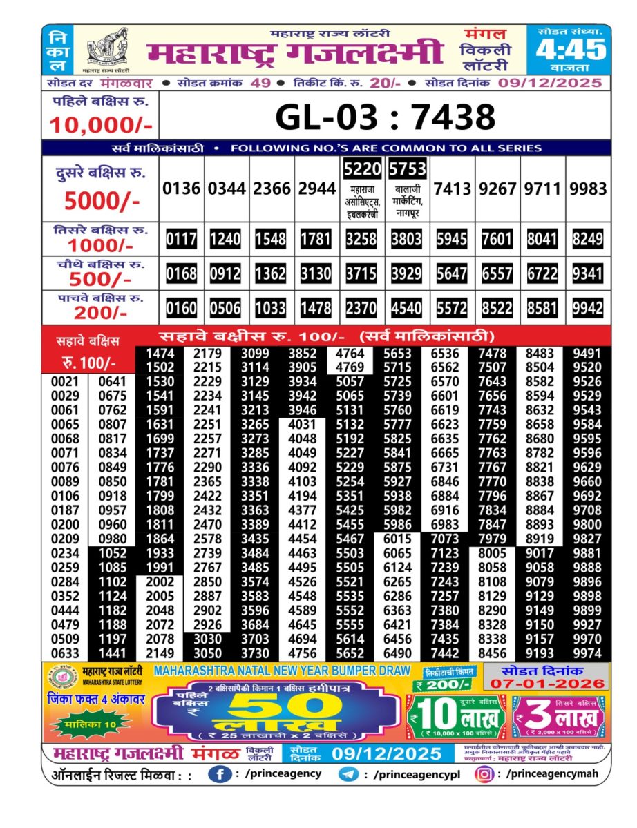 Maharashtra Gajlaxmi Lottery Result 09.12.2025 December 9, 2025 Leave a Comment on Maharashtra Gajlaxmi Lottery Result 09.12.2025 Share: XFacebookPinterestRedditVKDiggLinkedinMix Related Articles 0 97 Rajshree 10 Evening Weekly Lottery 5:40 Pm Result 04.06.2025 0 110 Dear 10 Red Friday Weekly 1:30 Pm Result 16.05.2025 0 72 Rajshree Orchid Weekly Lottery 4 PM Result 02.08.2025 0 69 Dear Blitzen Monday Weekly Lottery 6 PM Result 28.07.2025