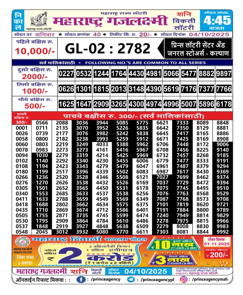 Maharashtra Gajlaxmi Weekly Lottery 4.45 PM Result 04.10.2025 October 4, 2025 Leave a Comment on Maharashtra Gajlaxmi Weekly Lottery 4.45 PM Result 04.10.2025 Share: XFacebookPinterestRedditVKDiggLinkedinMix Related Articles 0 78 Maharashtra Gajlaxmi Weekly Lottery 4:45 Pm Result 06.06.2025 0 145 Rajshree Jasmine Weekly Lottery 4 Pm Result 13.06.2025 0 25 Maharashtra Ganeshlaxmi Weekly Lottery 5 PM Result 14.10.2025 0 75 Dear Super Peral Wednesday Weekly Lottery 7 Pm Result 11.06.2025