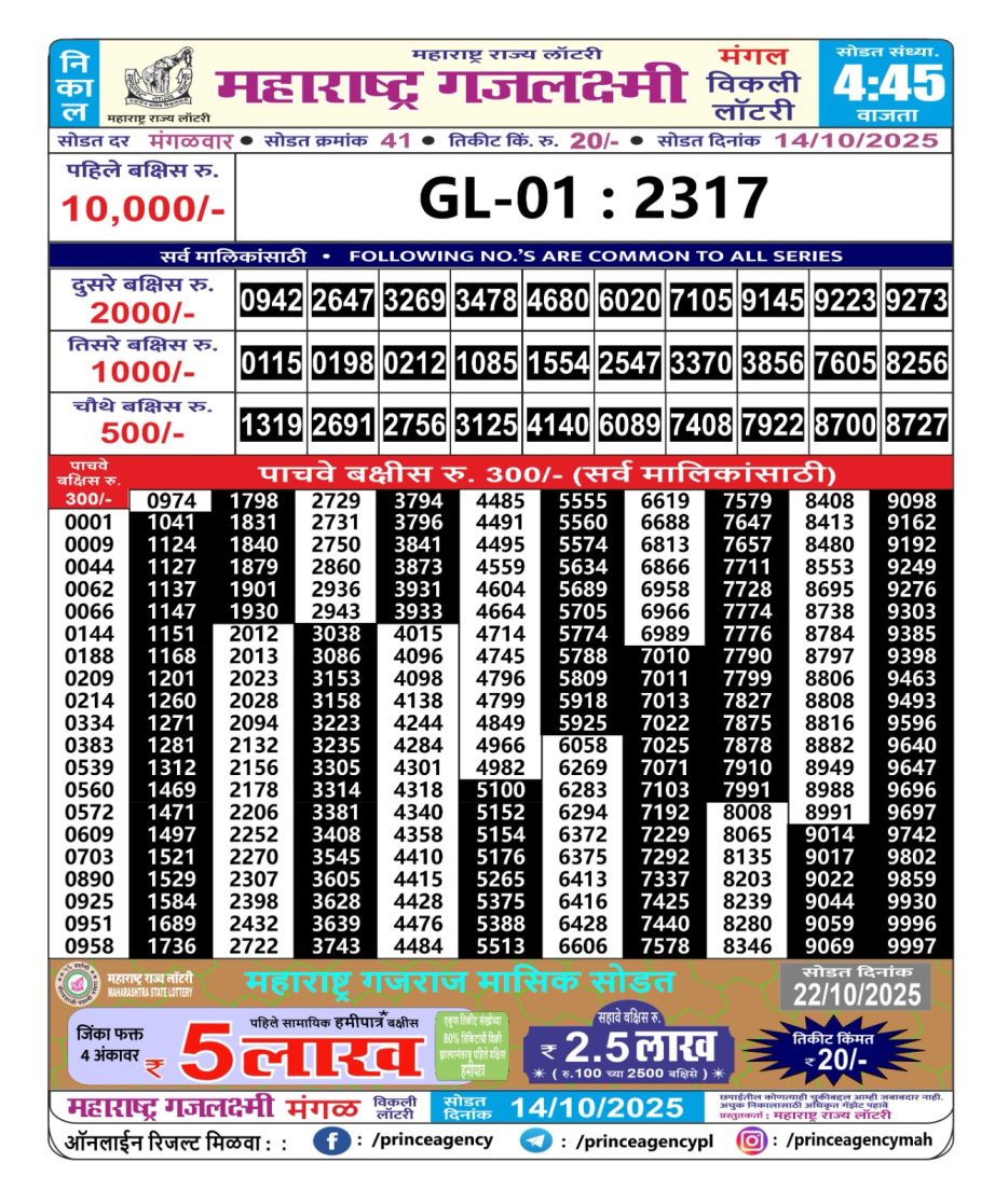 Maharashtra Gajlaxmi Weekly Lottery 4.45 PM Result 14.10.2025 October 14, 2025 Leave a Comment on Maharashtra Gajlaxmi Weekly Lottery 4.45 PM Result 14.10.2025 Share: XFacebookPinterestRedditVKDiggLinkedinMix Related Articles 0 113 Rajshree 50 Shani Weekly Lottery 7:30 Pm Result 10.5.2025 0 81 Labh Laxmi Glad Thursday Weekly Lottery 4 Pm Result 29.05.2025 0 35 Rajshree 50 Shani Weekly Lottery 7:30 PM Result 18.10.2025 0 77 Maharashtra Laxmi Weekly Lottery 4:15 PM Result 21.06.2025