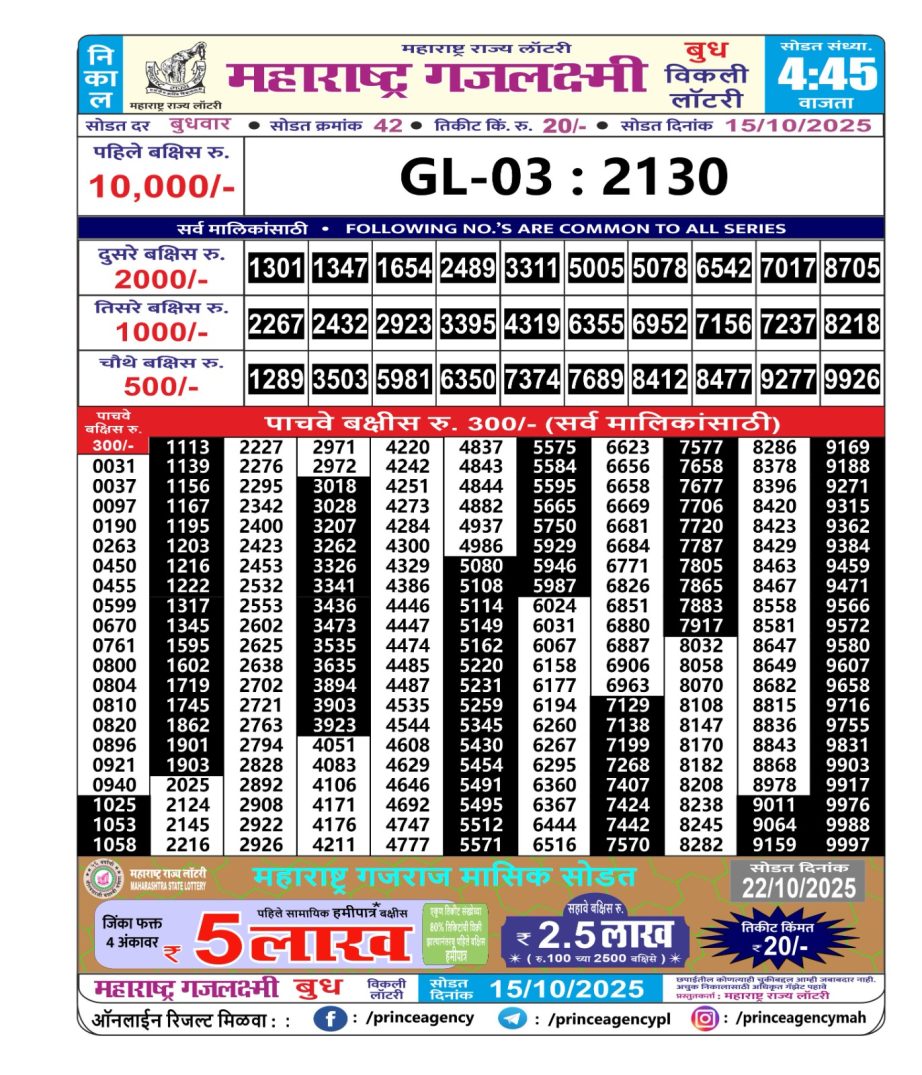 Maharashtra Gajlaxmi Weekly Lottery 4.45 PM Result 15.10.2025 October 15, 2025 Leave a Comment on Maharashtra Gajlaxmi Weekly Lottery 4.45 PM Result 15.10.2025 Share: XFacebookPinterestRedditVKDiggLinkedinMix Related Articles 0 57 Maharashtra Sahyadri Weekly Lottery 4.30 PM Result 09.08.2025 0 102 Golden Star Shukra Weekly Lottery 9 Pm Result 30 May 2025 0 29 Maharashtra Mohini Weekly Lottery 4.30 PM Result 05.10.2025 0 87 Rajshree 30 Som Weekly Lottery 8:30 PM Result 28.04.2025