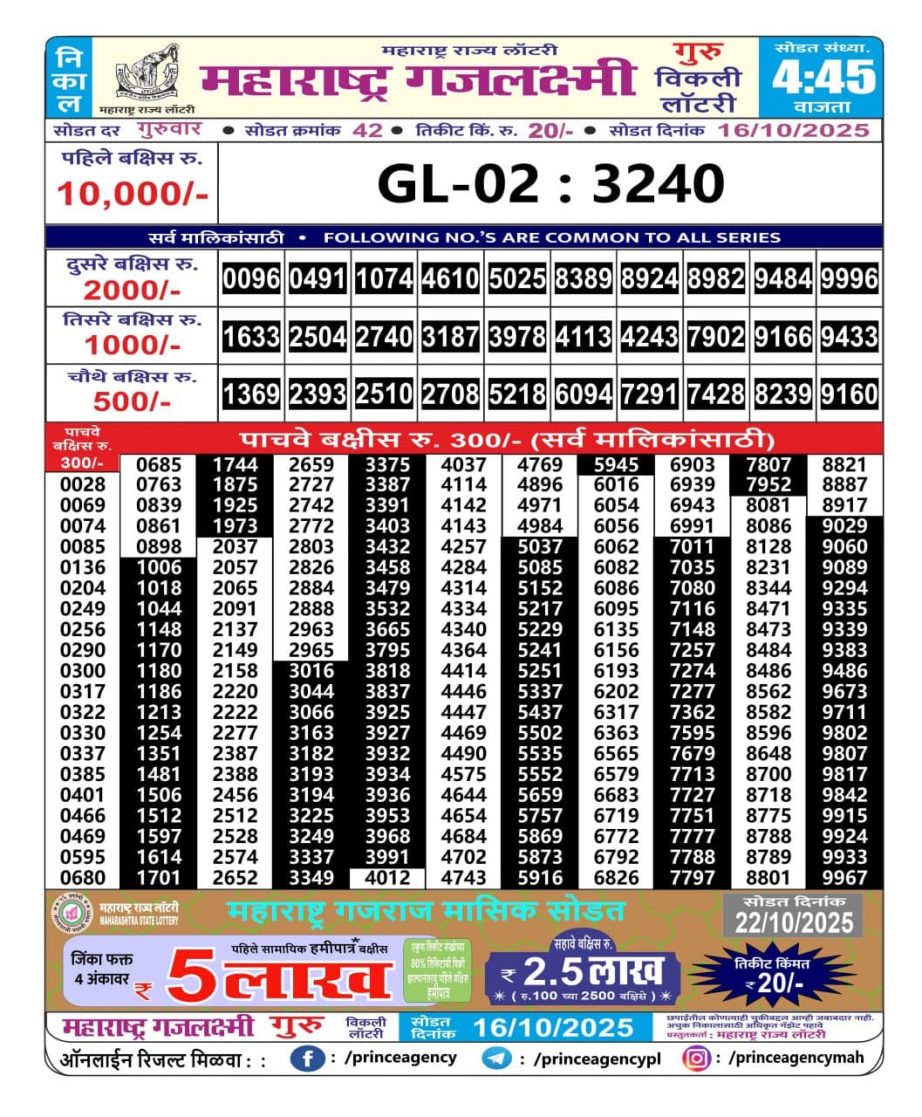 Maharashtra Gajlaxmi Weekly Lottery 4.45 PM Result 16.10.2025 October 16, 2025 Leave a Comment on Maharashtra Gajlaxmi Weekly Lottery 4.45 PM Result 16.10.2025 Share: XFacebookPinterestRedditVKDiggLinkedinMix Related Articles 0 30 Rajshree Night Lottery 9pm Result 22.10.2025 0 74 Maharashtra Padmini Weekly Lottery 4:15 PM Result 17.06.2025 0 59 Dear 50 Chenab Wednesday Weekly Lottery 5 PM Result 23.07.2025 0 84 Rajshree 10 Evening Weekly Lottery 5:40 Pm Result 22.05.2025