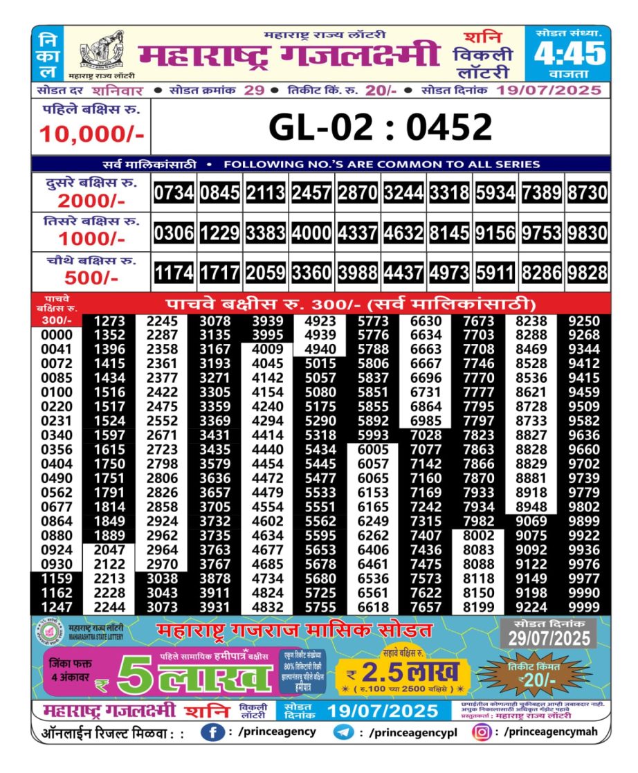 Maharashtra Gajlaxmi Weekly Lottery 4.45 PM Result 19.07.2025 July 19, 2025 Leave a Comment on Maharashtra Gajlaxmi Weekly Lottery 4.45 PM Result 19.07.2025 Share: XFacebookPinterestRedditVKDiggLinkedinMix Related Articles 0 60 Punjab State Dear 10 Gold Monday Weekly Lottery 6 PM Result 14.07.2025 0 28 Rajshree Sunflower Weekly Lottery 4 PM Result 12.10.2025 0 94 Golden Star Shukra Weekly Lottery 9 PM Result 05.09.2025 0 49 Labh Laxmi Joy Saturday Weekly Lottery 4 PM Result 02.08.2025