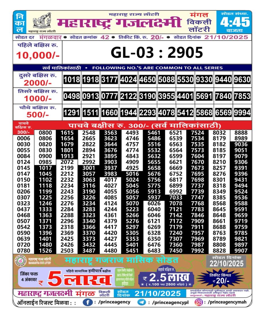 Maharashtra Gajlaxmi Weekly Lottery 4.45 PM Result 21.10.2025 October 21, 2025 Leave a Comment on Maharashtra Gajlaxmi Weekly Lottery 4.45 PM Result 21.10.2025 Share: XFacebookPinterestRedditVKDiggLinkedinMix Related Articles 0 40 Dear Blitzen Monday Weekly Lottery 6 PM Result 06.10.2025 0 90 Rajshree Mangal Weekly Lottery 1:00 Pm Result 13.05.2025 0 68 Dear Dwarka Monday Weekly Lottery 1 PM Result 21.07.2025 0 139 Golden Star Guru Weekly Lottery 9 PM Result 01 May 2025