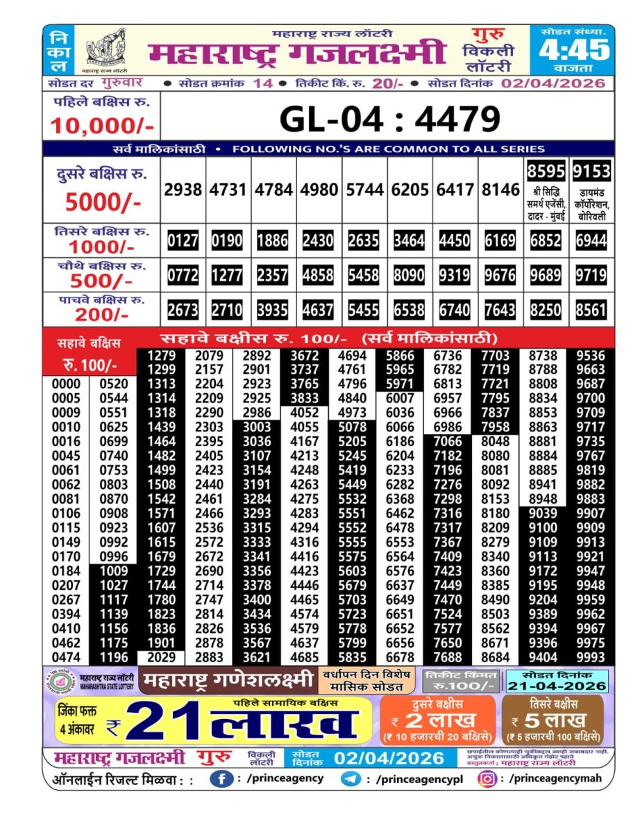 02 04 2026  Leave a Comment on Maharashtra Gajlaxmi Weekly Lottery Result 02.04.2026