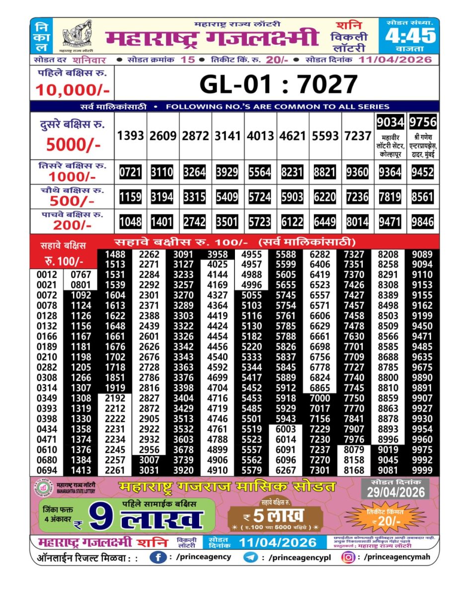 Maharashtra Gajlaxmi Weekly Lottery Result 11.04.2026 11 04 2026 Leave a Comment on Maharashtra Gajlaxmi Weekly Lottery Result 11.04.2026 Share: XFacebookPinterestRedditVKDiggLinkedinMix Related Articles 0 82 Dear Lucky Saturday Weekly Lottery 8 PM Result 03.01.2026 0 167 Rajshree Monday Weekly Lottery 8 PM Result 10.11.2025 0 115 Rajshree jasmine Weekly Lottery 4 PM Result 28.11.2025 0 74 Rajshree Friday Weekly Lottery 8 PM Result 19.12.2025