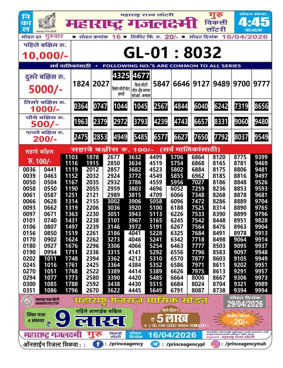 Maharashtra Gajlaxmi Weekly Lottery Result 16.04.2026 16 04 2026 Leave a Comment on Maharashtra Gajlaxmi Weekly Lottery Result 16.04.2026 Share: XFacebookPinterestRedditVKDiggLinkedinMix Related Articles 0 35 Maharashtra Maharashtra Laxmi Weekly Lottery Draw Result 14.03.2026 0 31 Rajshree Marigold Weekly Lottery 4 PM Result 30.03.2026 0 161 Dear legend Monday Weekly Lottery 6 PM Result 24.11.2025 0 8 Dear Crown Friday Weekly Lottery 6 PM Result 17.04.2026