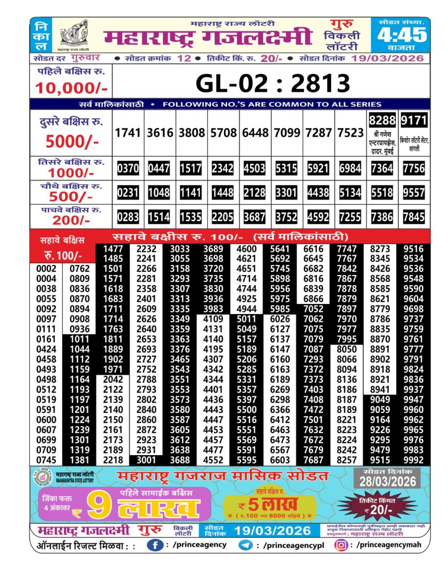 Maharashtra Gajlaxmi Weekly Lottery Result 19.03.2026 19 03 2026 Leave a Comment on Maharashtra Gajlaxmi Weekly Lottery Result 19.03.2026 Share: XFacebookPinterestRedditVKDiggLinkedinMix Related Articles 0 15 Rajshree Night 9pm Lottery Result 02.04.2026 0 47 Rajshree Friday Weekly Lottery 8 PM Result 27.02.2026 0 128 Rajshree 10 Evening Weekly Lottery 5:40 PM Result 24.11.2025 0 23 Dear Clover Monday Weekly Lottery 8 PM Result 30.03.2026