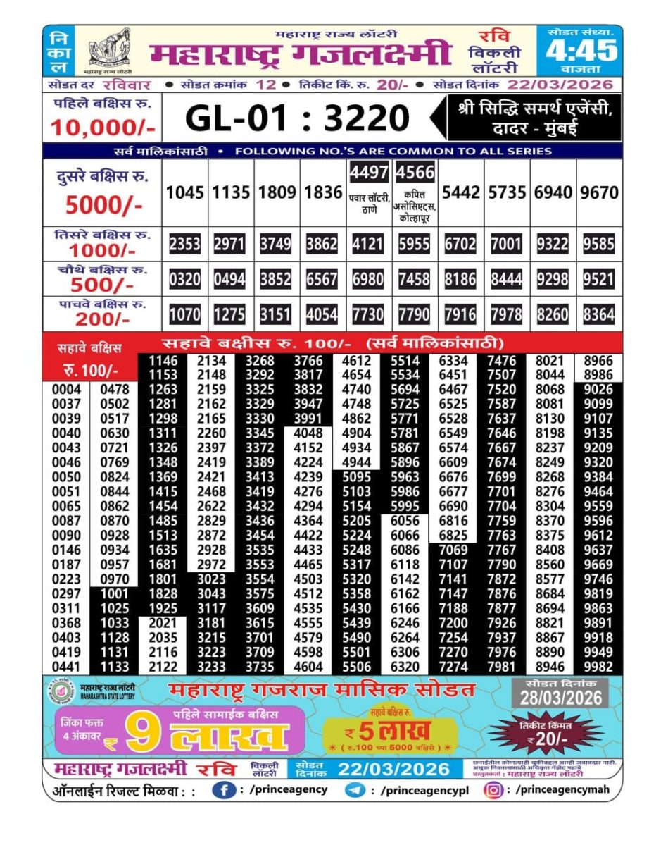 22 03 2026  Leave a Comment on Maharashtra Gajlaxmi Weekly Lottery Result 22.03.2026
