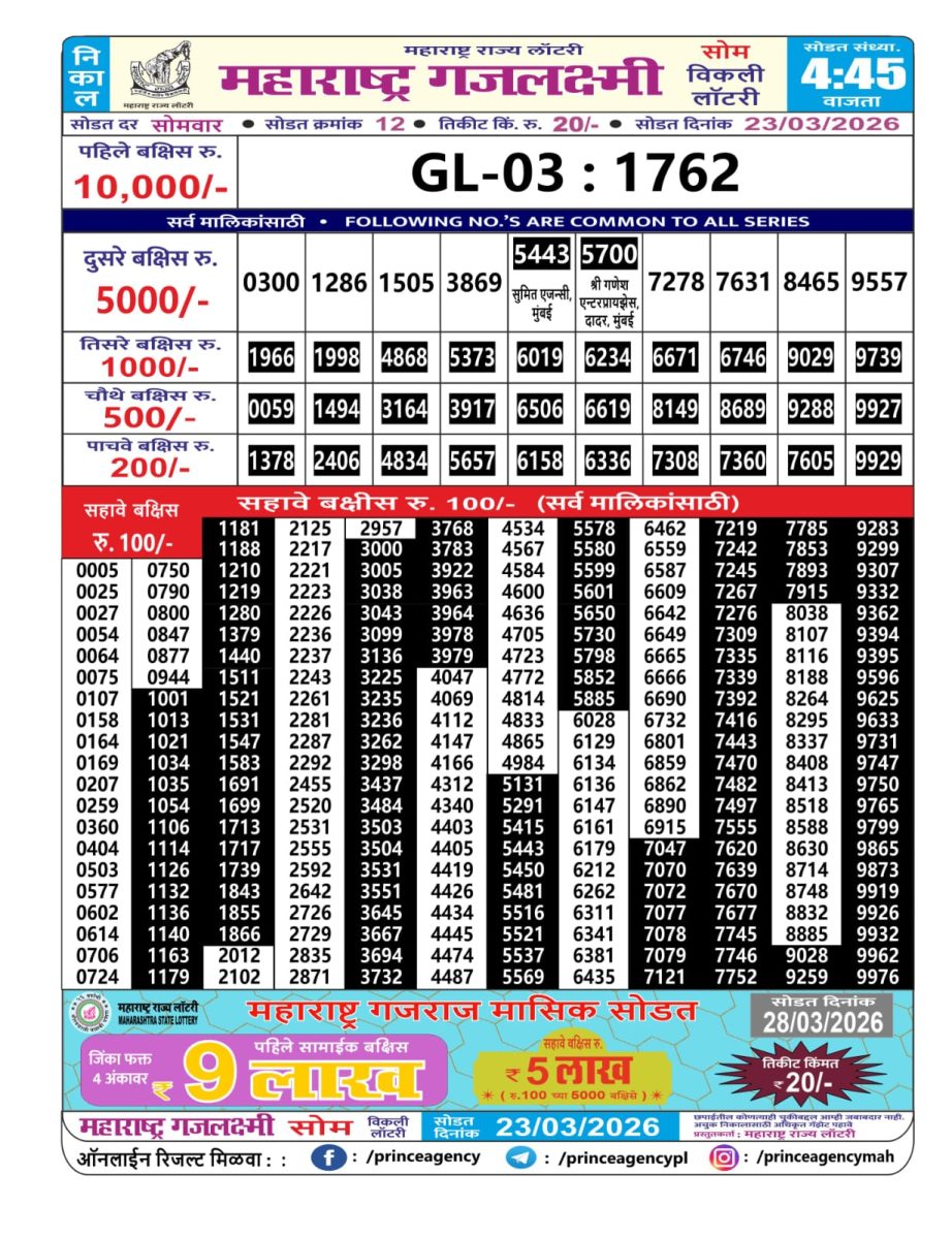 Maharashtra Gajlaxmi Weekly Lottery Result 23.03.2026 23 03 2026 Leave a Comment on Maharashtra Gajlaxmi Weekly Lottery Result 23.03.2026 Share: XFacebookPinterestRedditVKDiggLinkedinMix Related Articles 0 28 Rajshree Night 9pm Lottery Result 30.03.2026 0 109 Rajshree Ravi Weekly Lottery 1 PM Result 30.11.2025 0 127 Golden Star Som Weekly Lottery 9 PM Result 17.11.2025 0 56 Rajshree Wednessday Weekly Lottery 8 PM Result 12.02.2026