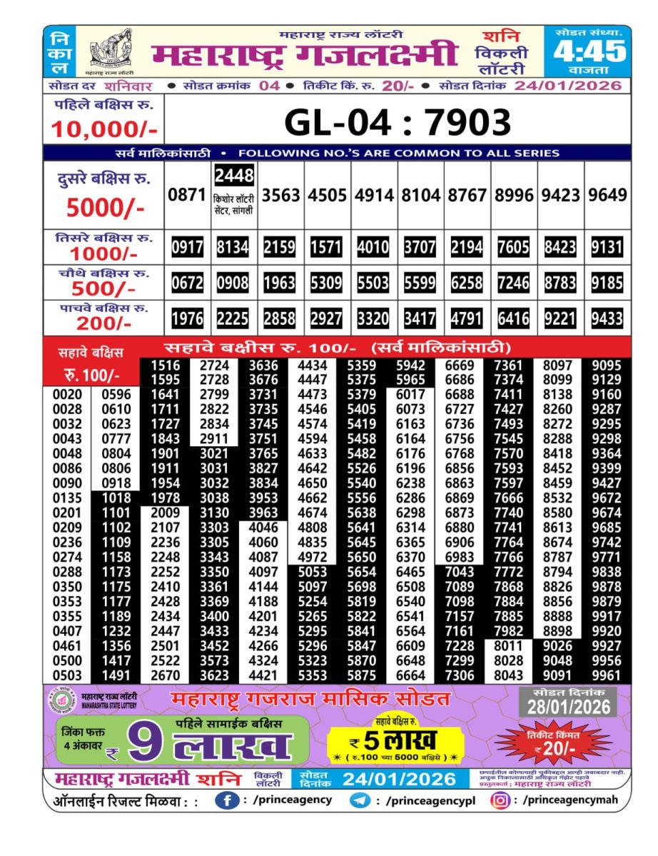 Maharashtra Gajlaxmi Weekly Lottery Result 24.01.2026 January 24, 2026 Leave a Comment on Maharashtra Gajlaxmi Weekly Lottery Result 24.01.2026 Share: XFacebookPinterestRedditVKDiggLinkedinMix Related Articles 0 89 Rajshree Som Weekly Lottery 1 PM Result 17.11.2025 0 131 Maharashtra Akshay Weekly Lottery 4:15 Pm Result 11.06.2025 0 110 Rajshree 100 Monthly Lottery 6.30 PM Result 03.07.2025 0 173 Dear 50 Sutluj Friday Weekly Lottery 5 PM Result 11.07.2025