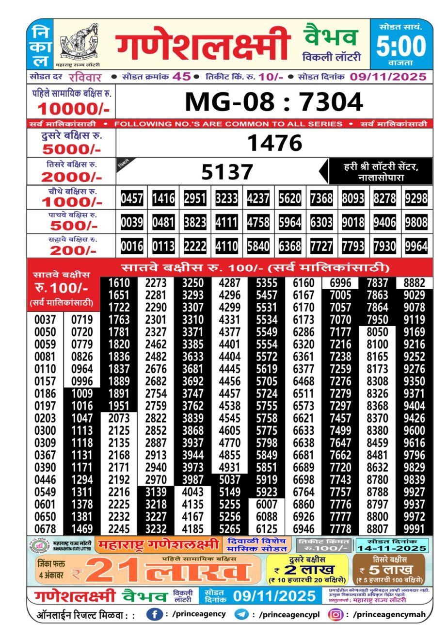 Maharashtra Ganeshlaxmi Weekly Lottery 5 PM Result 09.11.2025 November 9, 2025 Leave a Comment on Maharashtra Ganeshlaxmi Weekly Lottery 5 PM Result 09.11.2025 Share: XFacebookPinterestRedditVKDiggLinkedinMix Related Articles 0 108 Rajshree 50 Guru Weekly Lottery 7:30 PM Result 11.09.2025 0 62 Dear 10 Cedar Wednesday Weekly Lottery 7 PM Result 16.07.2025 0 59 Rajshree Som Weekly Lottery 8 PM Result 21.07.2025 0 35 Dear 10 Acacia Sunday Weekly Lottery 7 PM Result 21.09.2025
