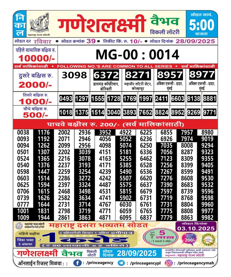 Maharashtra Ganeshlaxmi Weekly Lottery 5 PM Result 28.09.2025 September 28, 2025 Leave a Comment on Maharashtra Ganeshlaxmi Weekly Lottery 5 PM Result 28.09.2025 Share: XFacebookPinterestRedditVKDiggLinkedinMix Related Articles 0 219 Golden Star Shukra Weekly Lottery 9 Pm Result 23 May 2025 0 70 Golden Star Ravi Weekly Lottery 9 PM Result 13.07.2025 0 197 Rajshree Som Weekly Lottery 1:00 Pm Result 02.06.2025 0 167 Dear 10 Oak Thursday Weekly Lottery 7 Pm Result 12.06.2025