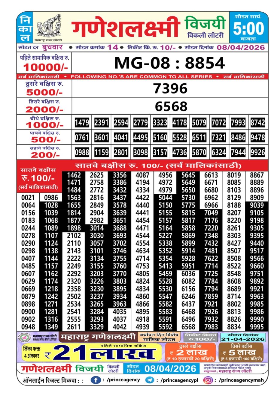 Maharashtra Ganeshlaxmi Weekly Lottery Result 08.04.2026 08 04 2026 Leave a Comment on Maharashtra Ganeshlaxmi Weekly Lottery Result 08.04.2026 Share: XFacebookPinterestRedditVKDiggLinkedinMix Related Articles 0 73 Maharashtra Gajlaxmi Weekly Lottery Result 01.03.2026 0 57 Rajshree 50 Shani Weekly Lottery 7:30 PM Result 07.02.2026 0 18 Rajshree 10 Evening Weekly Lottery 5:40 PM Result 12.04.2026 0 57 Golden Star Som Weekly Lottery 7 PM Result 09.03.2026