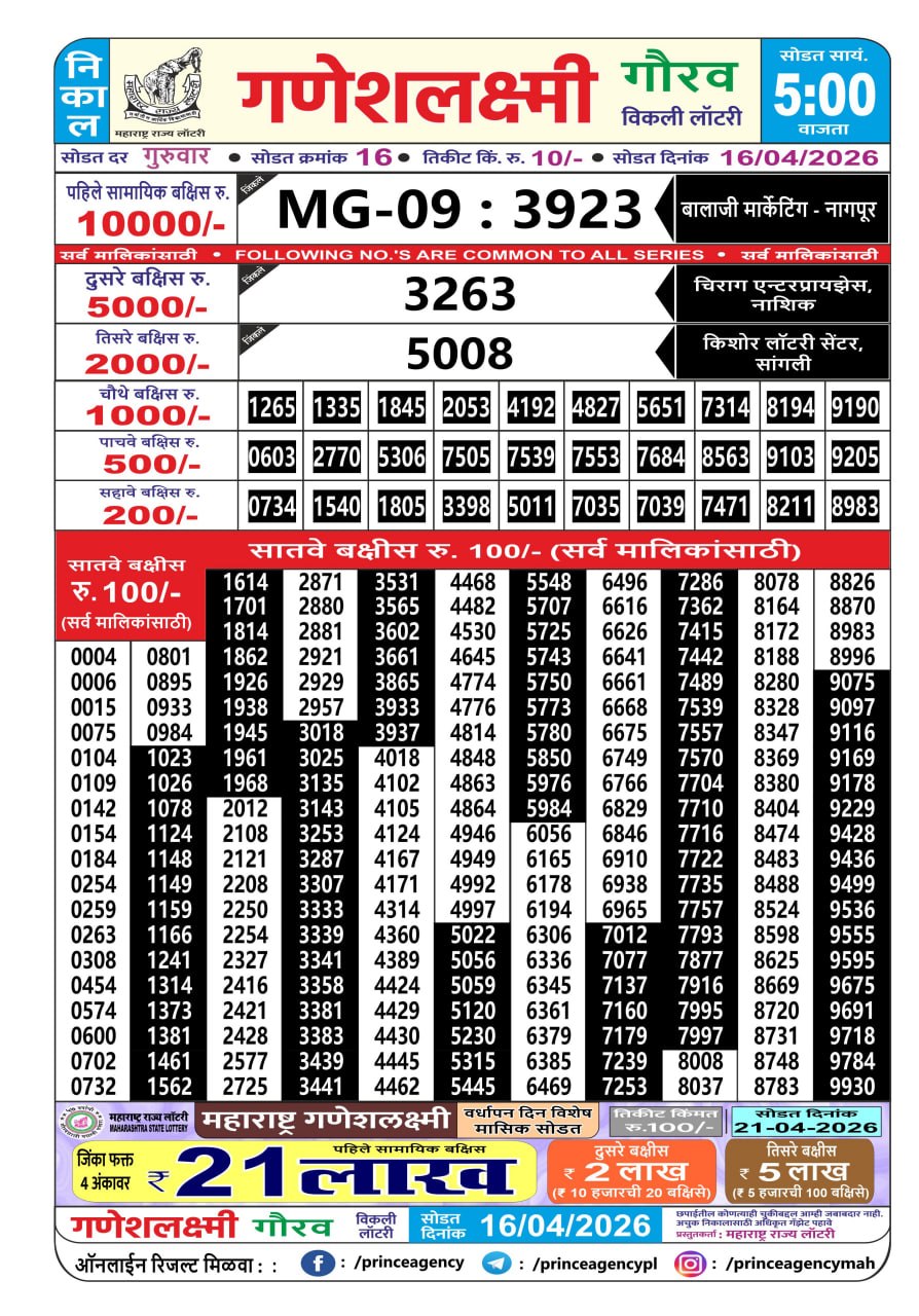 Maharashtra Ganeshlaxmi Weekly Lottery Result 16.04.2026 16 04 2026 Leave a Comment on Maharashtra Ganeshlaxmi Weekly Lottery Result 16.04.2026 Share: XFacebookPinterestRedditVKDiggLinkedinMix Related Articles 0 84 Maharashtra Laxmi Weekly Lottery Result 03.01.2026 0 79 Rajshree 10 Evening Weekly Lottery 5:40 PM Result 06.01.2026 0 84 Rajshree 50 Shukra Weekly Lottery 7:30 PM Result 12.12.2025 0 78 Labh Laxmi Delight Wednesday Weekly Lottery 4 PM Result 11.02.2026