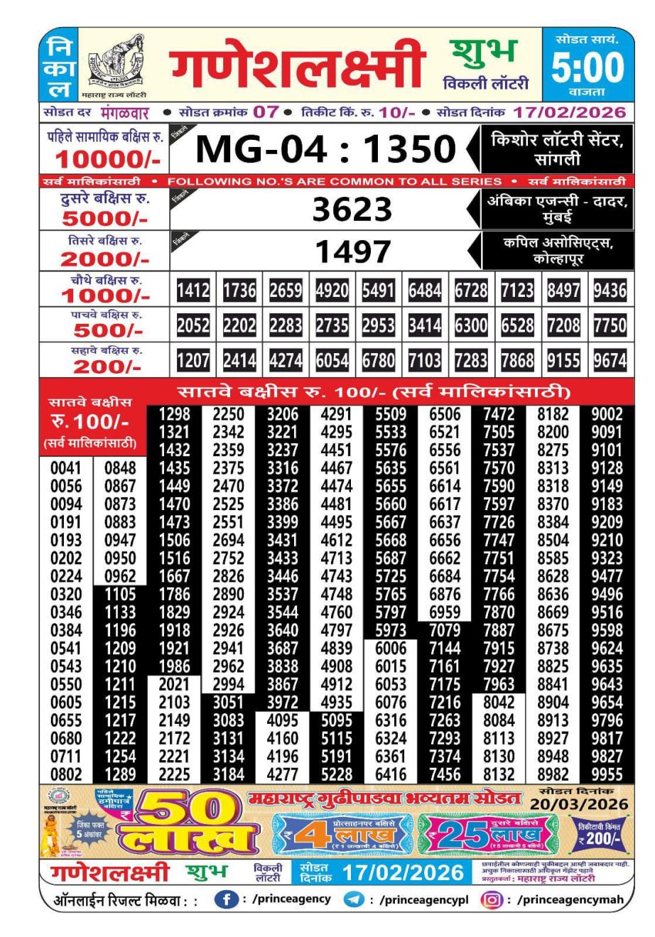 Maharashtra Ganeshlaxmi Weekly Lottery Result 17.02.2026 February 17, 2026 Leave a Comment on Maharashtra Ganeshlaxmi Weekly Lottery Result 17.02.2026 Share: XFacebookPinterestRedditVKDiggLinkedinMix Related Articles 0 127 Rajshree Tuesday Weekly Lottery 8 Pm Result 27.05.2025 0 40 Rajshree Tuesday Weekly Lottery 8 PM Result 13.01.2026 0 6 Dear Lucky Saturday Weekly Lottery 8 PM Result 28.02.2026 0 95 Maharashtra Padmini Weekly Lottery 4.15 PM Result 14.10.2025