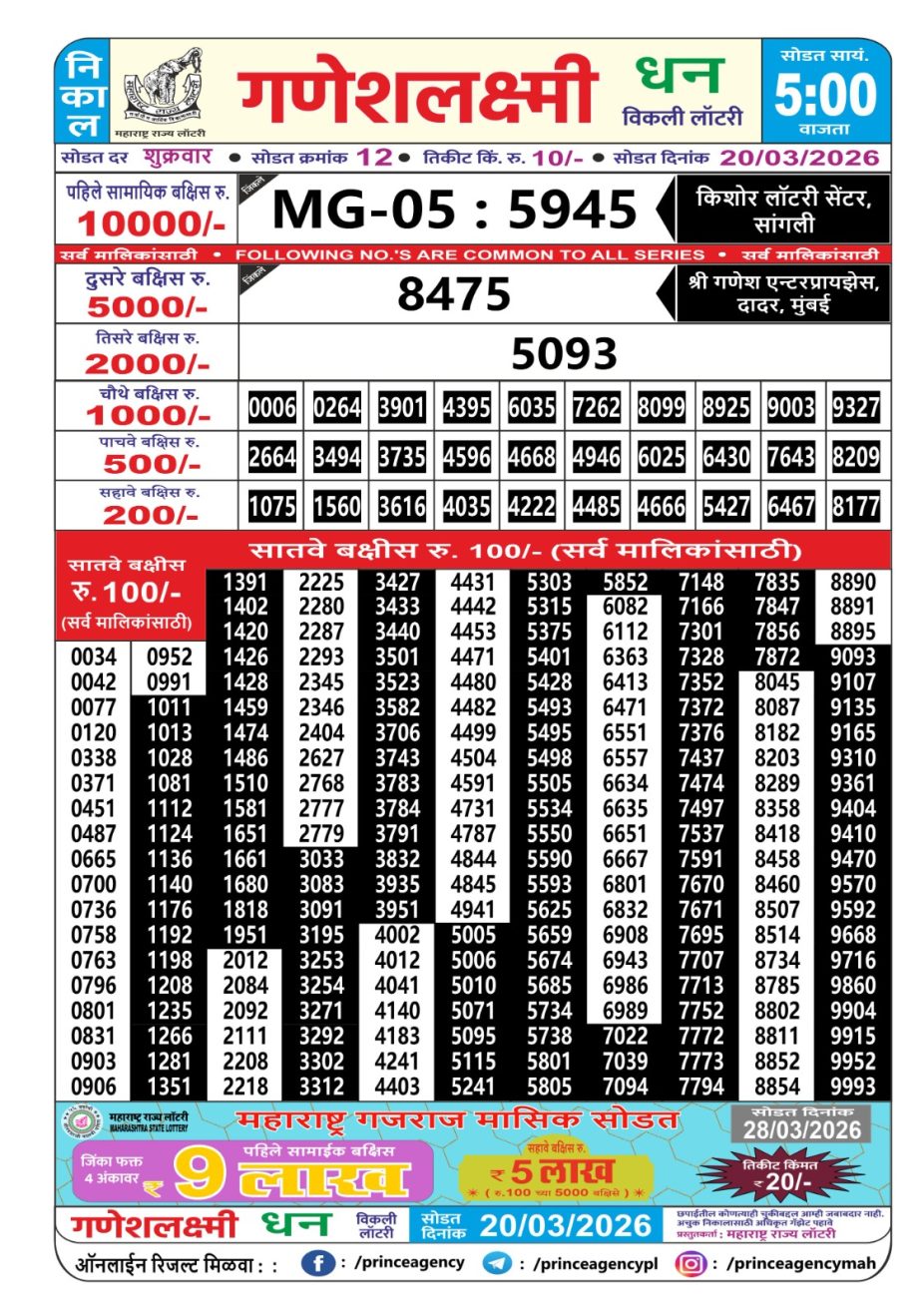 Maharashtra Ganeshlaxmi Weekly Lottery Result 20.03.2026 20 03 2026 Leave a Comment on Maharashtra Ganeshlaxmi Weekly Lottery Result 20.03.2026 Share: XFacebookPinterestRedditVKDiggLinkedinMix Related Articles 0 64 Dear Shine Tuesday Weekly Lottery 1 PM Result 03.02.2026 0 117 Maharashtra Akarshak Lottery Result,4.15pm,13.11.2025 0 46 Rajshree 10 Evening Weekly Lottery 5:40 PM Result 04.03.2026 0 73 Maharashtra Ganeshlaxmi Weekly Lottery Result 04.12.2025