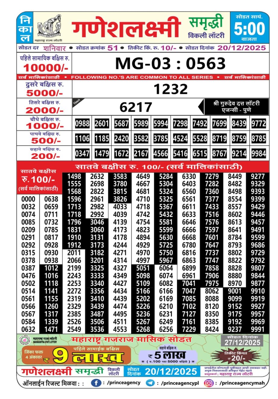 December 20, 2025  Leave a Comment on Maharashtra Ganeshlaxmi Weekly Lottery  Result 20.12.2025