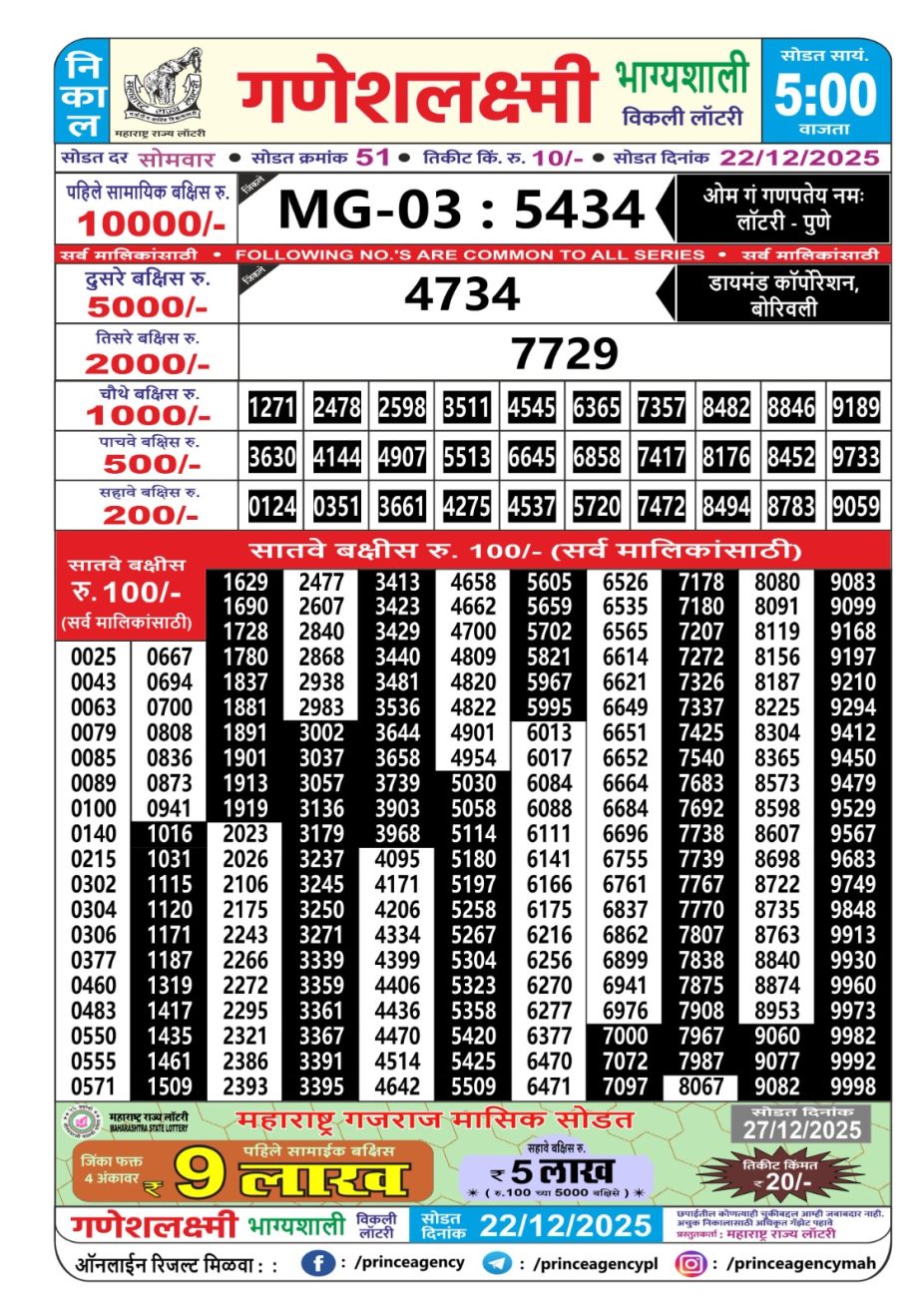 Maharashtra Ganeshlaxmi Weekly Lottery Result 22.12.2025 December 22, 2025 Leave a Comment on Maharashtra Ganeshlaxmi Weekly Lottery Result 22.12.2025 Share: XFacebookPinterestRedditVKDiggLinkedinMix Related Articles 0 95 Dear 10 Oak Thursday Weekly Lottery 7 PM Result 14.08.2025 0 134 Labh Laxmi Power Sunday Weekly Lottery 4 Pm Result 18.05.2025 0 196 Dear 10 Violet Sunday Weekly 1:30 Pm Result 18.05.2025 0 52 Maharashtra Ganeshlaxmi Weekly Lottery 5 PM Result 30.10.2025