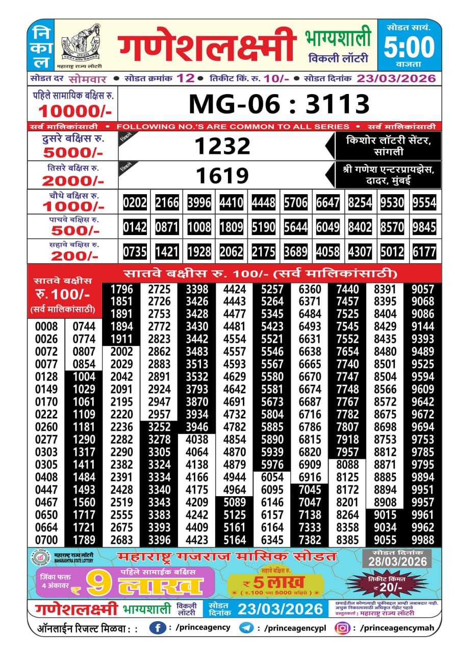 Maharashtra Ganeshlaxmi Weekly Lottery Result 23.03.2026 23 03 2026 Leave a Comment on Maharashtra Ganeshlaxmi Weekly Lottery Result 23.03.2026 Share: XFacebookPinterestRedditVKDiggLinkedinMix Related Articles 0 56 Rajshree Tuesday Weekly Lottery 8 PM Result 10.02.2026 0 90 Golden Star Shukra Weekly Lottery 9 PM Result 02.01.2026 0 68 Punjab State Dear 50 Beast Monday Weekly Lottery 6 PM Result 22.12.2025 0 12 Rajshree Night 9pm Lottery Result 04.04.2026