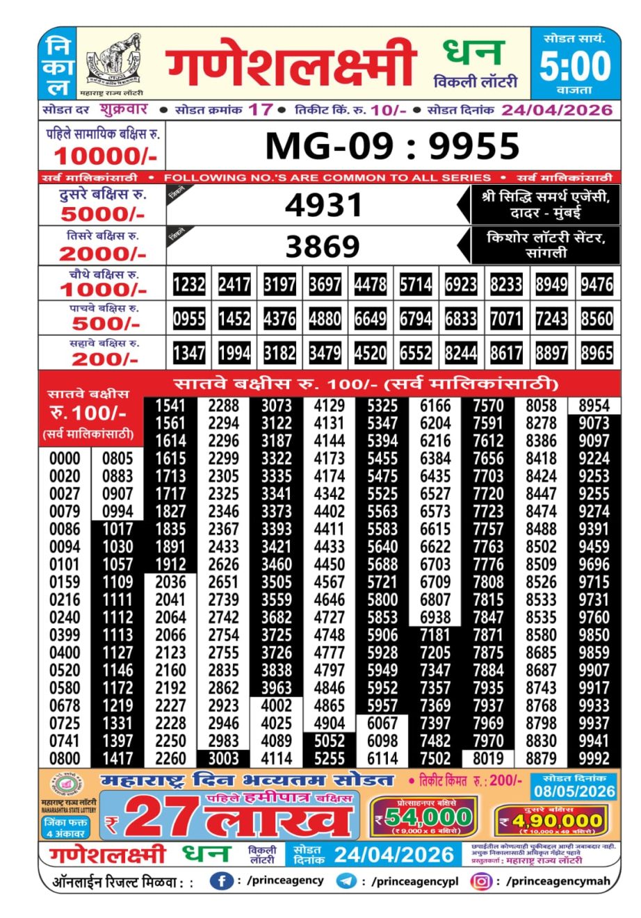 Maharashtra Ganeshlaxmi Weekly Lottery Result 24.04.2026 24 04 2026 Leave a Comment on Maharashtra Ganeshlaxmi Weekly Lottery Result 24.04.2026 Share: XFacebookPinterestRedditVKDiggLinkedinMix Related Articles 0 93 Labh Laxmi Delight Wednesday Weekly Lottery 4 PM Result 17.12.2025 0 86 Maharashtra Sagar laxmi lottery result 08.12.2025 0 98 Maharashtra Ganeshlaxmi Weekly Lottery Result 17.12.2025 0 25 Maharashtra Gajlaxmi Weekly Lottery Result 14.04.2026