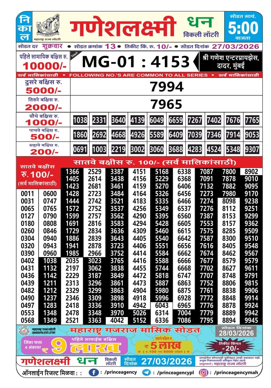 Maharashtra Ganeshlaxmi Weekly Lottery Result 27.03.2026 27 03 2026 Leave a Comment on Maharashtra Ganeshlaxmi Weekly Lottery Result 27.03.2026 Share: XFacebookPinterestRedditVKDiggLinkedinMix Related Articles 0 186 Dear magic Sunday Weekly Lottery 8 PM Result 16.11.2025 0 30 Dear Spark Wednessday Weekly Lottery 1 PM Result 18.03.2026 0 58 Maharashtra Gajlaxmi Lottery Result 08.01.2026 0 79 Rajshree Budh Weekly Lottery 1 PM Result 17.12.2025